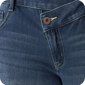 These jeans feature an asymmetric waist and low-rise design for a modern, effortless look. With wide-leg and relaxed fit, they offer comfort and freedom of movement for casual activities. Equipped with back and side pockets, zip fly, and floor-length cut, they are both stylish and functional. Made with medium four-way stretch fabric, they adapt to your body and move with you all day.