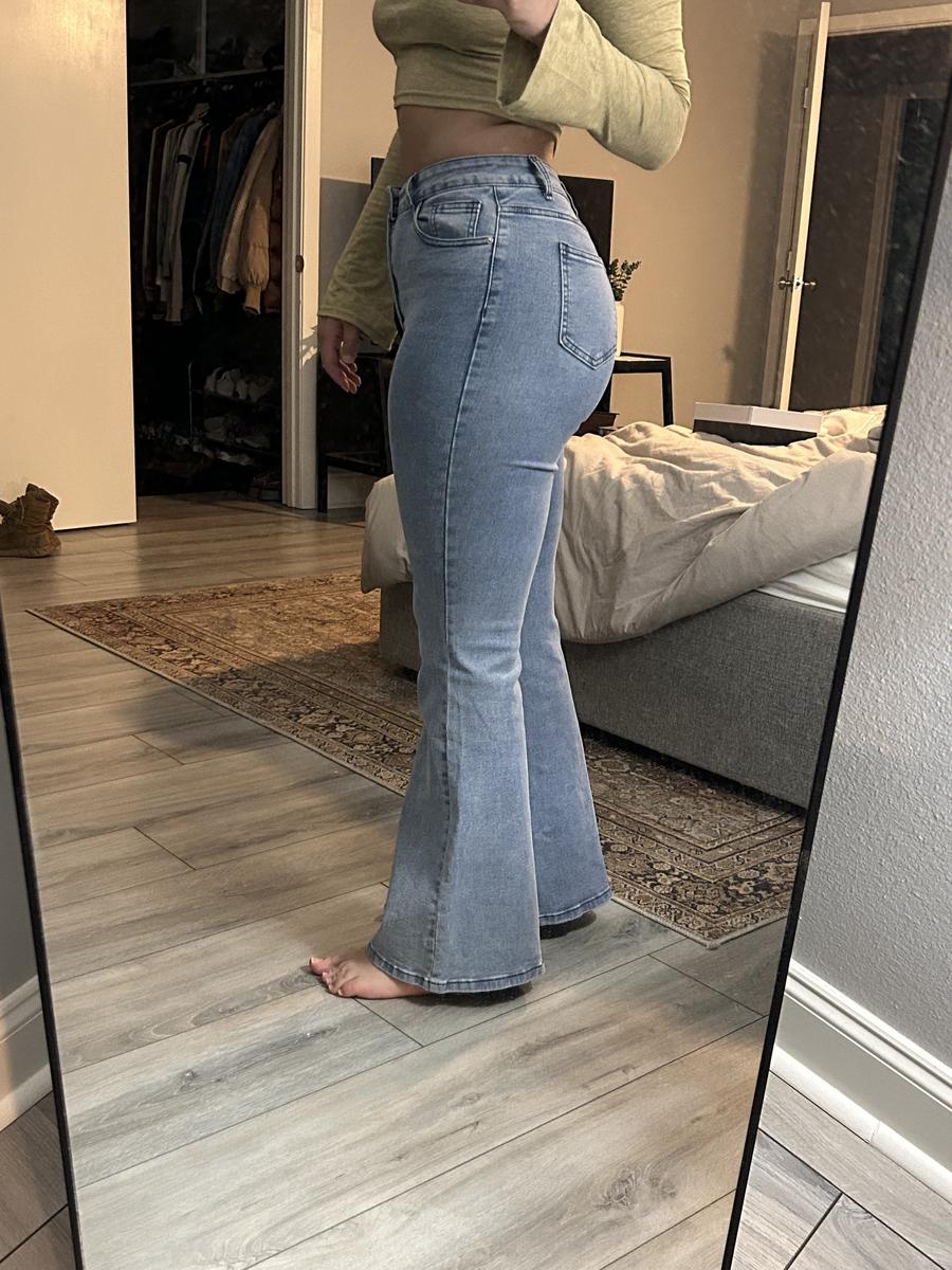 These jeans are awesome!! I have never ever had a pair of jeans fit me in the length perfectly. And the stretch is,chefs kiss! they are my favorite pair the fit is perfect and it’s great quality they also don’t leave a gap!!